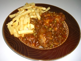 Cover and cook gently for 30 minutes. Add mushrooms and peas. Cook for a further 15 minutes and serve with chips or mashed potatoes.
